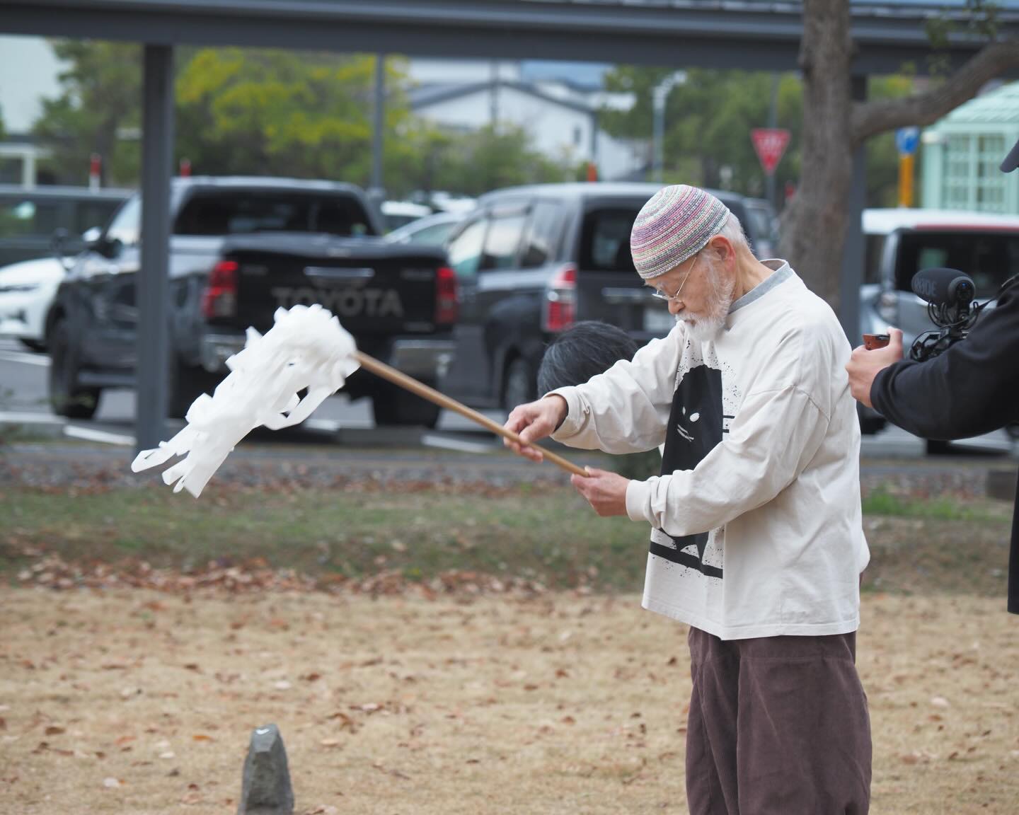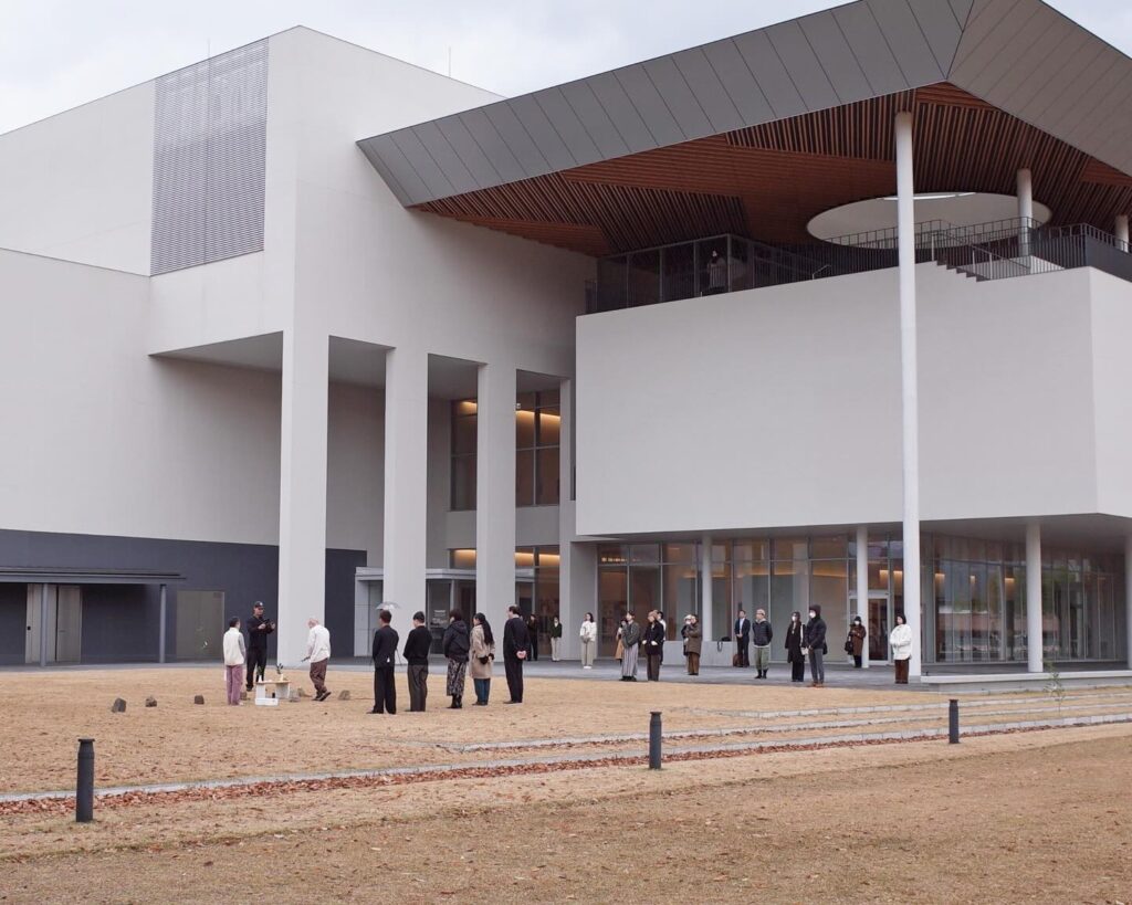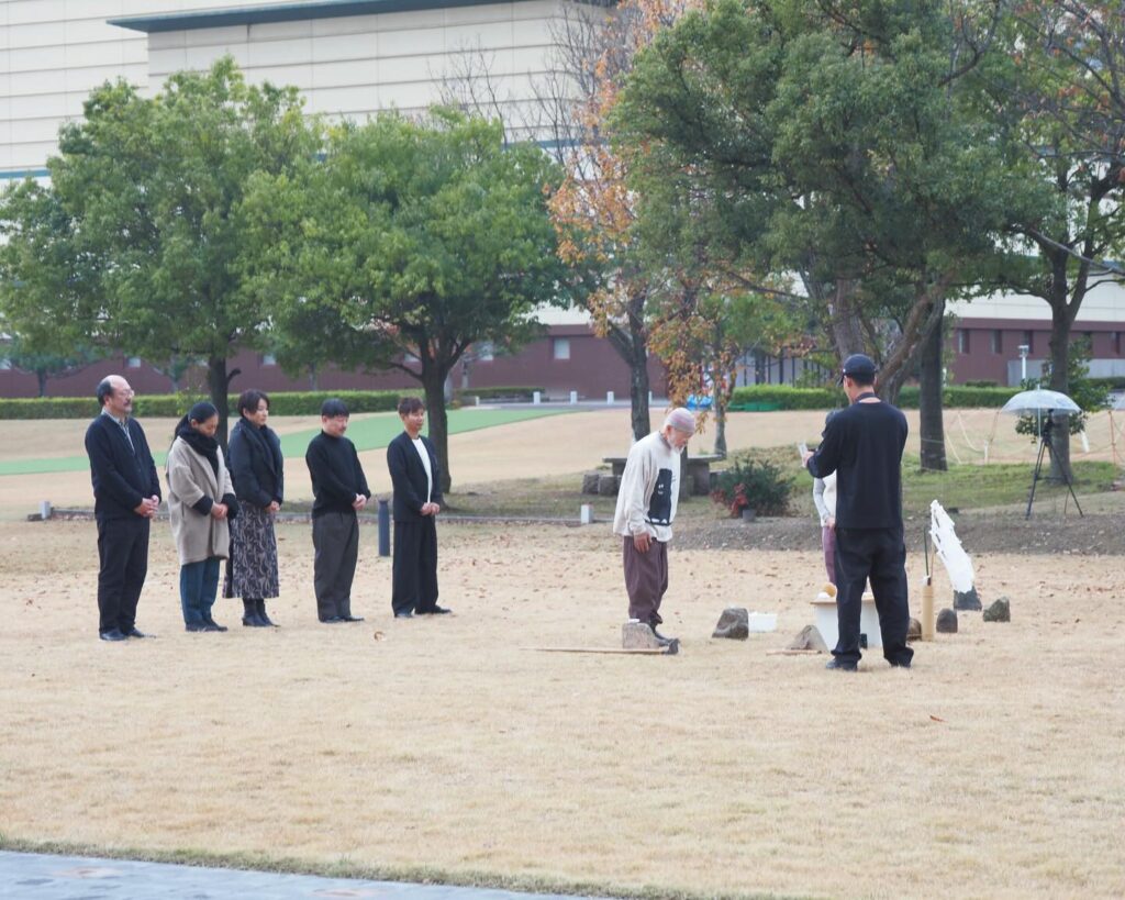 鳥取県立美術館西側に広がる屋外エリア「創作の森」にサウンド・アーティスト 鈴木昭男による彫刻作品《いざない 2025》をはじめ、3点のコミッションワークを設置される。2026年1月の着工を前に工事の無事を祈念して、鈴木昭男と宮北裕美によるパフォーマンス形式の地鎮祭を執り行った。
